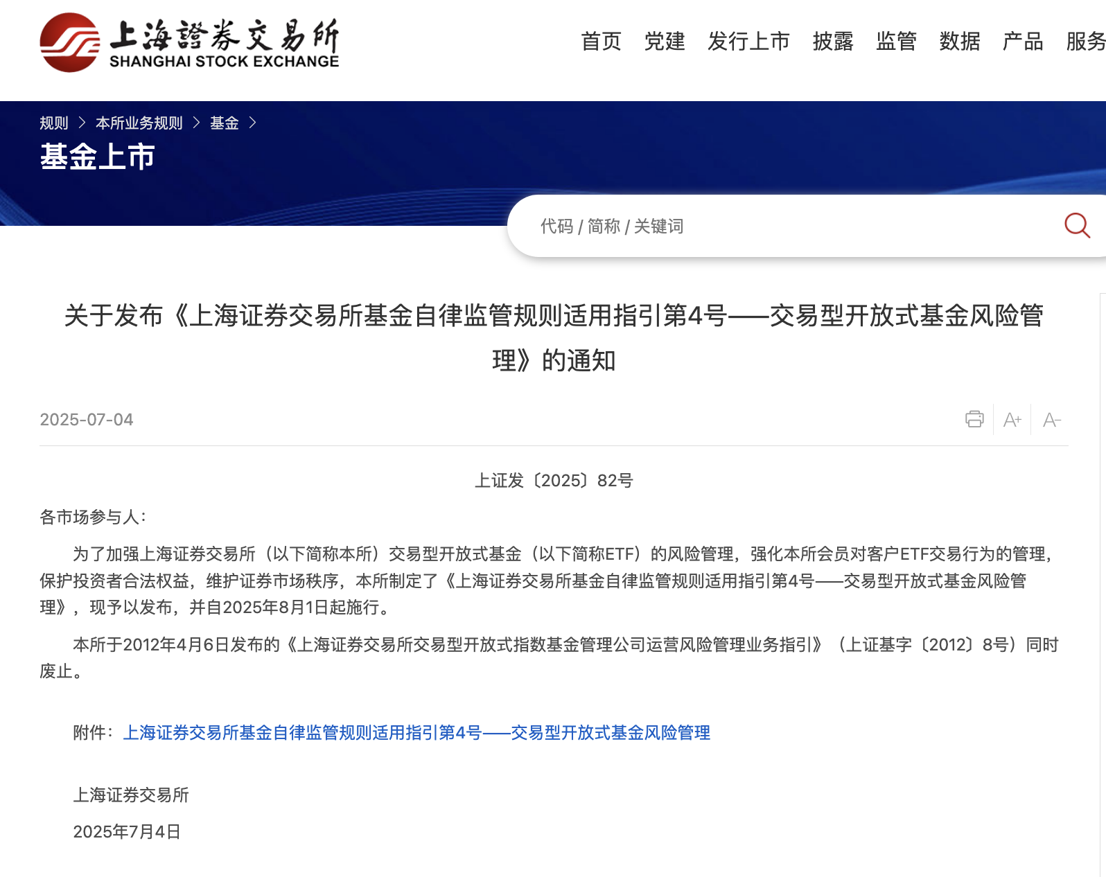 本報訊 (記者毛藝融)7月4日,記者從上海證券交易所獲悉,上交所修訂并發布《上海證券交易所基金自律監管規則適用指引第4號——交易型開放式基金風險管理》(以下簡稱《ETF風險管理指引》)。這是貫徹落實中國證監會《促進資本市場指數化投資高質量發展行動方案》,強化ETF風險管理,更好保護投資者合法權益的重要舉措。