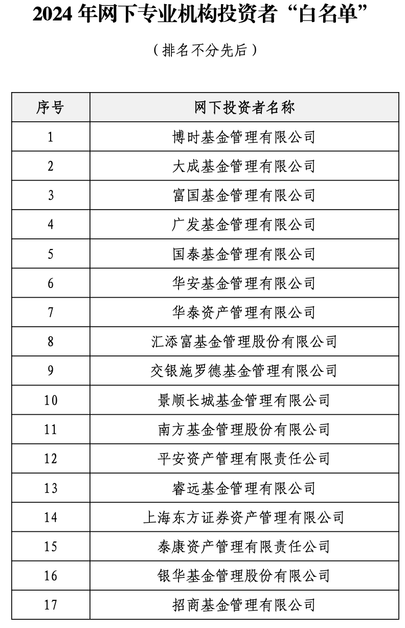 為深入貫徹落實黨的二十屆三中全會和中央金融工作會議精神、新“國九條”決策部署以及中國證監會“科創板八條”有關要求,強化詢報價行為監管,充分發揮網下專業機構投資者示范帶動作用,7月25日,中國證券業協會(以下簡稱協會)發布2024年網下專業機構投資者“白名單”。