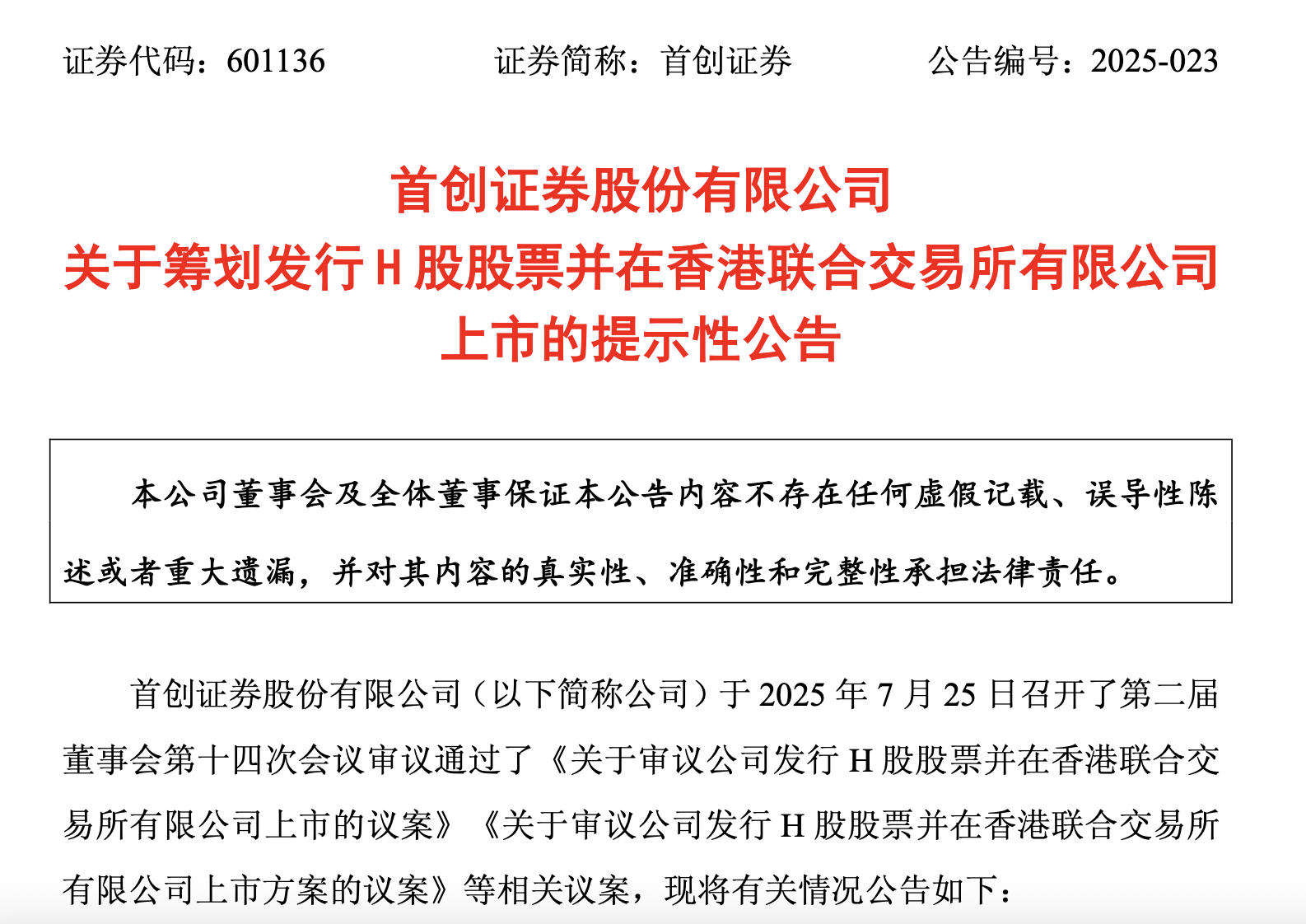 7月25日晚間,首創證券發布公告稱,于2025年7月25日召開了第二屆董事會第十四次會議審議通過了《關于審議公司發行H股股票并在香港聯合交易所有限公司上市的議案》《關于審議公司發行H股股票并在香港聯合交易所有限公司上市方案的議案》等相關議案。