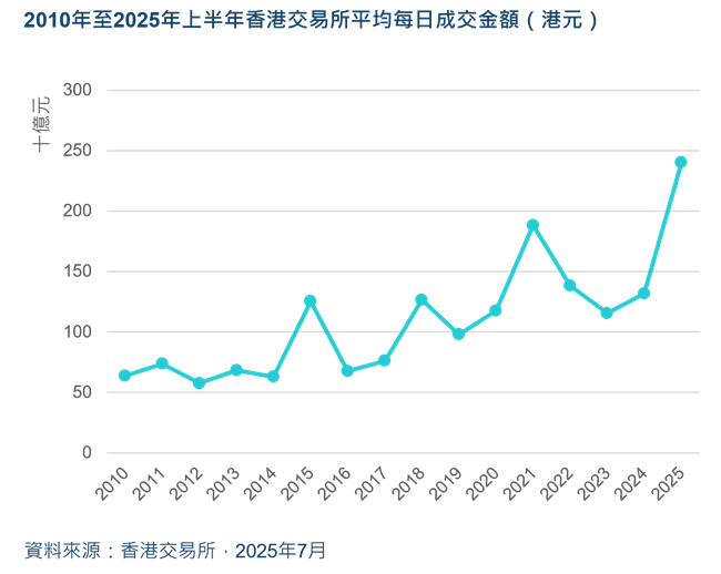 數據顯示,2025年上半年,香港市場平均每日成交金額為2402億港元,較去年同期的1104億港元增長118%。市值方面,截至2025年6月底,香港市場的市值為42.7萬億港元,較去年同期的32.1萬億港元增長33%。