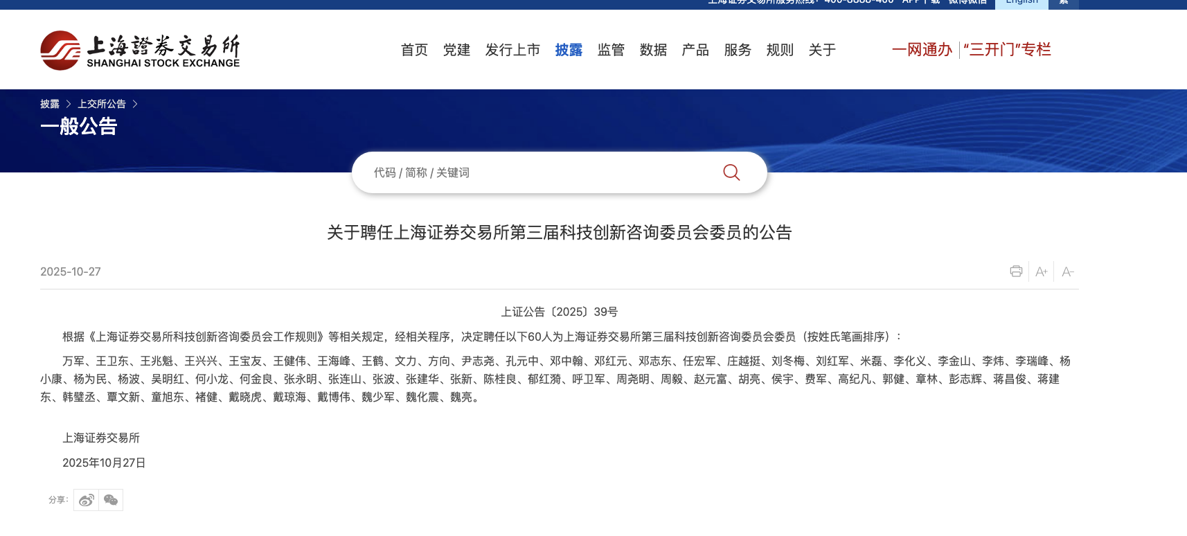 本報訊 (記者毛藝融)10月27日晚,上交所官網發布消息稱,已聘任第三屆科技創新咨詢委員會(以下簡稱“咨詢委”)委員,并向社會公布。