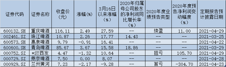 截至4月8日,已有5家啤酒行業上市公司披露2020年年報或年度業績預告,2020年凈利潤實現或有望實現同比增長的公司達到4家。