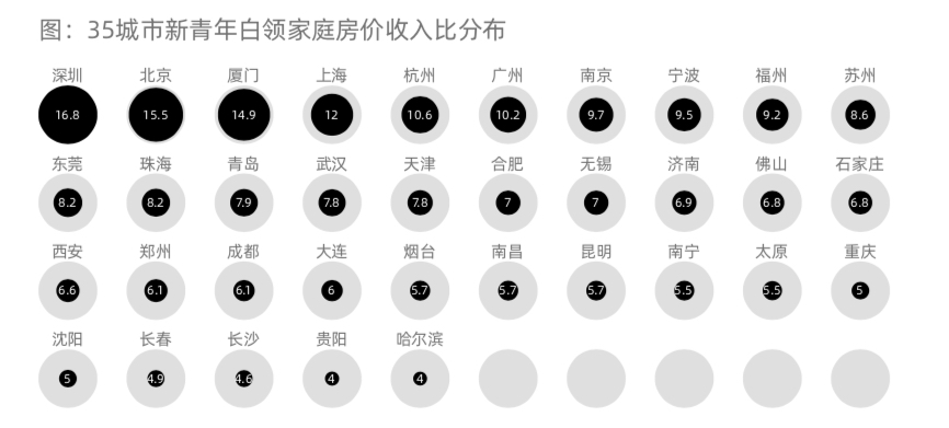 如果考慮到收入水平,深圳、北京、廈門、上海、杭州等14城房價收入比處于高位;南寧、太原、重慶等8城房價收入比處于低位;天津、合肥、無錫、濟南、佛山、石家莊等13城房價收入比處于合理區間。