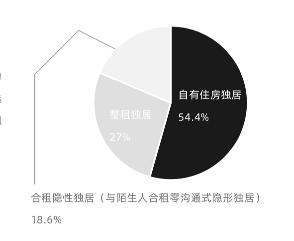 報告顯示,在新青年受訪群體中,獨居的百分占比高達63.6%。從居住方式看,選擇自由住房獨居的約54.4%,其次是整租獨居,百分占比約27%,還有18.6%的受訪者因與陌生人合租零溝通,隱形獨居。