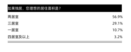 從購房選擇看,兩居室是獨居群體的理想居住戶型。39.3%的受訪者表示理想的獨居住房面積是60-90平方米,34.4%的受訪者認為理想的獨居住房面積為90-120平方米;從戶型看,理想的獨居住房是兩居室,占比達56.9%。