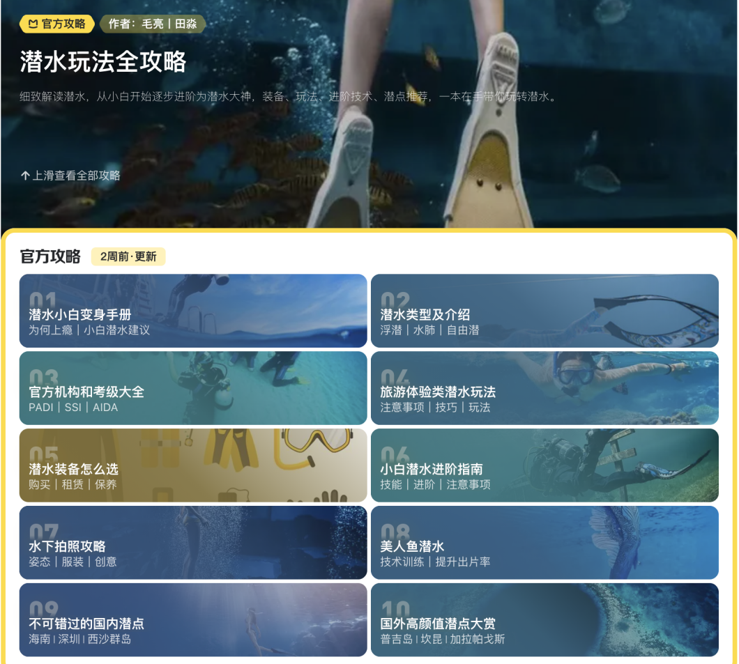“北極星攻略”是馬蜂窩推出的一站式系統(tǒng)化旅游攻略,用全面、及時(shí)和準(zhǔn)確的信息解決游客旅行前后關(guān)心的問題,并且用精選思維進(jìn)行旅行玩樂產(chǎn)品的篩選。馬蜂窩的北極星攻略也專門為潛水、滑雪、馬拉松等運(yùn)動(dòng)項(xiàng)目建立了專屬攻略,需要哪些準(zhǔn)備工作、國內(nèi)優(yōu)質(zhì)簽點(diǎn)、考證必備知識(shí)等實(shí)用信息一應(yīng)俱全,通過一站式信息島幫助游客輕松入門‘小眾’運(yùn)動(dòng)。