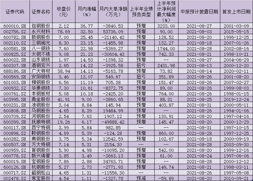 表:月內股價實現上漲的鋼鐵股一覽