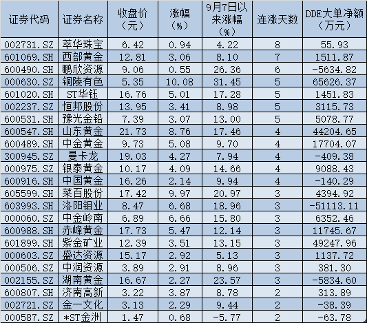 9月13日,除次新股菜百股份延續漲停外,白銀有色、銅陵有色、ST華鈺等個股也均以漲停價報收,此外,山東黃金、洛陽鉬業、中金嶺南、赤峰黃金、中金黃金等個股漲幅也均在5%以上。另據統計,萃華珠寶、西部黃金、鵬欣資源、銅陵有色、ST華鈺、恒邦股份、豫光金鉛等7只個股連漲5天及以上。