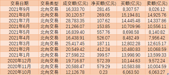 周三,北向資金全天凈買入21.4億元,此前連續兩日凈賣出,其中滬股通凈買入25.25億元,深股通凈賣出3.85億元。9月份以來北向資金凈流入281.47億元,在11個交易日內,已較8月份269.05億元的凈流入有所增加,是連續11個月凈流入,今年以來北向資金合計凈買入額達2894.74億元,已超過去年全年的2089.32億元,連續六年保持凈流入態勢,北向資金累計凈流入總金額則超過了1.5萬億元。