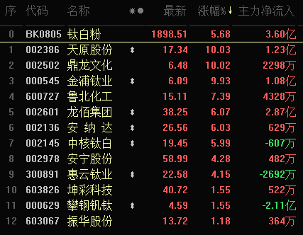 鈦白粉周三領漲各板塊,截至收盤,鈦白粉板塊收報1898.51點,漲5.68%,板塊中12只個股全數上漲,其中,天原股份、鼎龍文化、金浦鈦業等3只個股漲停報收,另有,魯北化工(7.39%)、龍佰集團(6.07%)、安納達(6.03%)、中核鈦白(5.99%)等個股漲幅超5%。