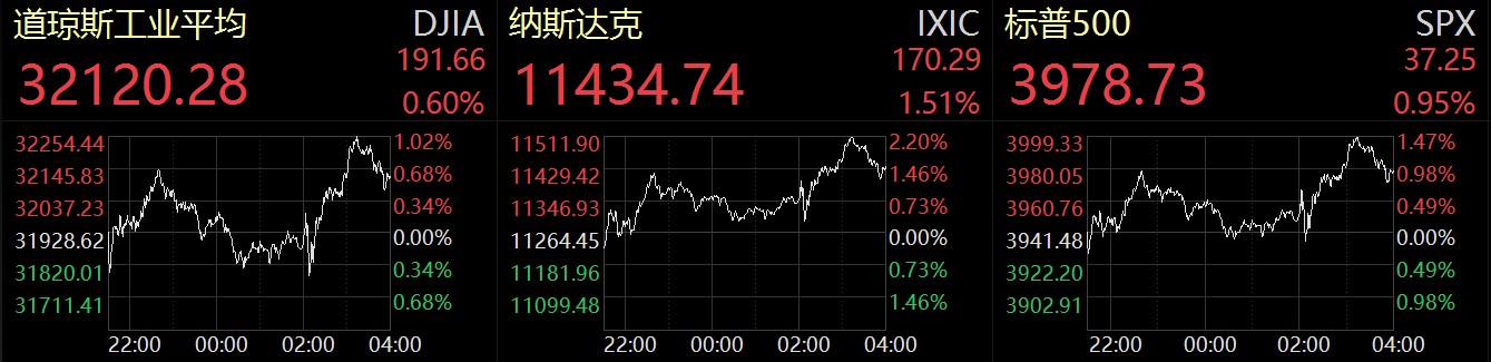 受此消息影響,當(dāng)?shù)貢r(shí)間5月25日,美股三大指數(shù)尾盤集體拉升,截至收盤,三大指數(shù)集體收漲,道瓊斯指數(shù)漲0.6%,報(bào)32120.28點(diǎn);標(biāo)普500指數(shù)漲0.95%,報(bào)3978.73點(diǎn);納斯達(dá)克指數(shù)漲1.51%,報(bào)11434.74點(diǎn)。