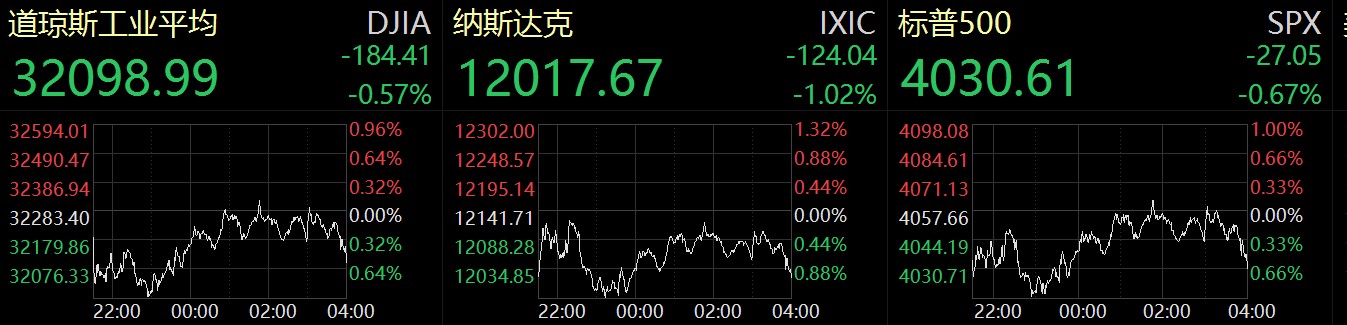 個股來看,科技股普跌,超威半導體跌2.95%,英偉達跌2.82%,蘋果跌1.37%,微軟跌1.07%,推特跌1.04%,谷歌-C跌0.86%,亞馬遜跌0.73%;中概股漲跌不一,拼多多漲14.71%,高途漲11.73%,名創優品漲4.16%,知乎漲2.13%,新東方漲0.71%,嗶哩嗶哩跌5.11%,每日優鮮跌7.69%,網易有道跌9.29%。