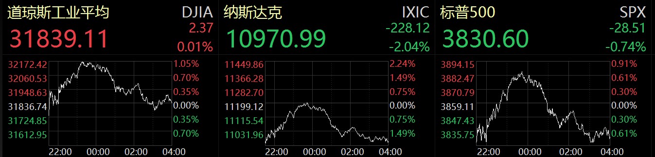 當地時間10月26日,美股三大指數收盤漲跌不一,其中,道瓊斯指數漲0.01%,報31839.11點;標普500指數跌0.74%,報3830.60點;納斯達克指數跌2.04%,報10970.99點。其中,納斯達克指數和標普500指數終結連續3個交易日的上漲行情。