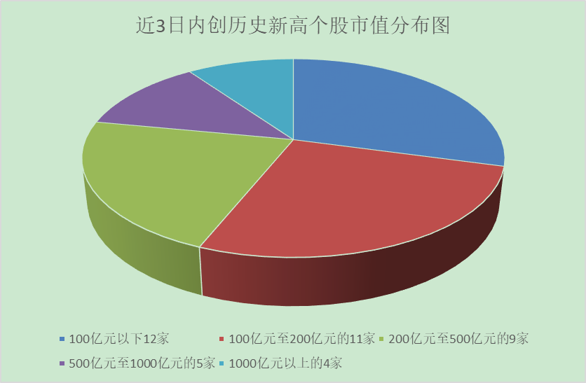 首先,以中小流通市值股為主。數(shù)據(jù)顯示,近3日內(nèi)股價(jià)創(chuàng)歷史新高的公司流通市值在100億元以下的有12家,流通市值在100億元至200億元的有11家,流通市值在200億元至500億元的有9家,流通市值在500億元至1000億元的有5家,流通市值在1000億元以上的有4家。從占比來(lái)看,200億元以下市值個(gè)股占比達(dá)到56.10%,1000億元以上市值個(gè)股占比0.98%。市值低于100億元的個(gè)股分別為:元隆雅圖、格爾軟件、春風(fēng)動(dòng)力、淳中科技、萬(wàn)集科技、佳發(fā)教育、珀萊雅、荃銀高科、誠(chéng)邁科技、中新賽克、億聯(lián)網(wǎng)絡(luò)、捷佳偉創(chuàng)。