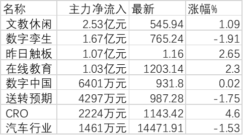 從大單資金流向來看,僅文教休閑(2.53億元)、數字孿生(1.67億元)、昨日觸板(1.07億元)、在線教育(1.03億元)、數字中國(6401萬元)、送轉預期(4297萬元)、CRO(2224萬元)、汽車行業(1461萬元)等8類板塊呈資金凈流入狀態;大單資金流出的板塊則集中在融資融券(-210億元)、富時概念(-174億元)、標普概念(-158億元)、證金持股(-134億元)、深股通(-109億元)等,資金流出金額均在100億元之上。