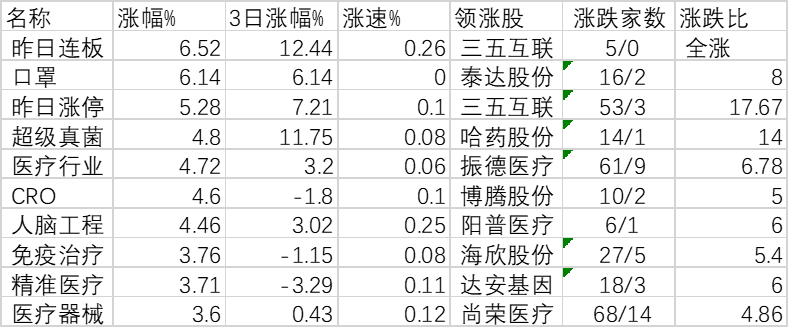 從板塊走勢來看,上午有61類板塊上漲,昨日連板(6.52%)、口罩(6.14%)、昨日漲停(5.28%)、超級真菌(4.8%)、醫療行業(4.72%)、CRO(4.6%)、人腦工程(4.46%)、免疫治療(3.76%)、精準醫療(3.71%)、醫療器械(3.6%)等板塊居漲幅榜前10位;有272類板塊下跌,旅游酒店(-5.68%)、工藝商品(-5.43%)、在線旅游(-5.41%)、裝修裝飾(-4.99%)、雞肉概念(-4.92%)、園林工程(-4.78%)、船舶制造(-4.65%)、賽馬概念(-4.58%)、白酒(-4.49%)、海南板塊(-4.32%)等板塊居跌幅榜前10位。