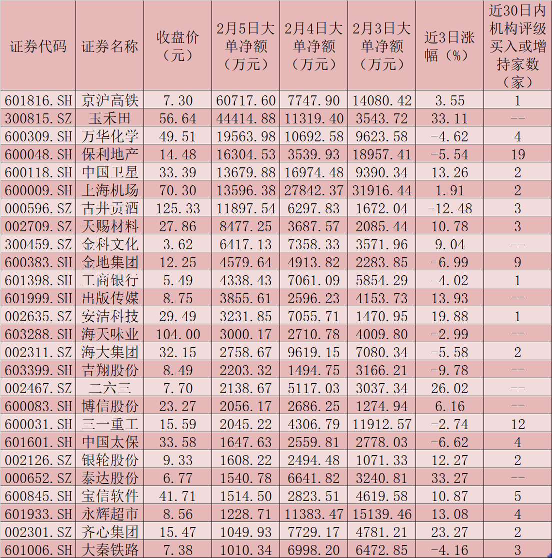 進一步統計發現,有25只個股近3日累計大單資金凈流入超過1億元,京滬高鐵、上海機場、玉禾田、中國衛星、萬華化學、保利地產、永輝超市等7只個股近3日均受到2億元以上大單資金搶籌,包括古井貢酒、海大集團、三一重工、金科文化、工商銀行、大秦鐵路、天賜材料等在內的18只個股期間累計大單資金凈流入也均超過1億元。