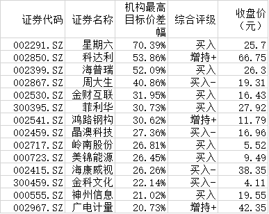 評級機(jī)構(gòu)對上述101家公司中的75家給予了推薦評級,占比74.26%。數(shù)據(jù)進(jìn)一步顯示,有33家公司股票最新收盤價,較機(jī)構(gòu)推薦目標(biāo)價還有差距,其中,有包括星期六(70.39%)、科達(dá)利(53.86%)、海普瑞(52.09%)等在內(nèi)的14只個股距機(jī)構(gòu)最高目標(biāo)價還有超過20%的價差,值得投資者密切關(guān)注。