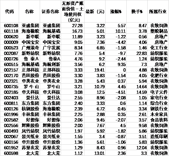 綜合來看,農地儲備多的企業受到了更多的關注。《證券日報》研究部通過同花順對市場中土地流轉板塊公司進行統計,顯示板塊51只成份股中,有26只無形資產賬面價值(土地使用權)超過1億元,其中,亞盛集團(27.28億元)、海航基礎(16.73億元)、新華聯(11.89億元)等3只個股過10億元。