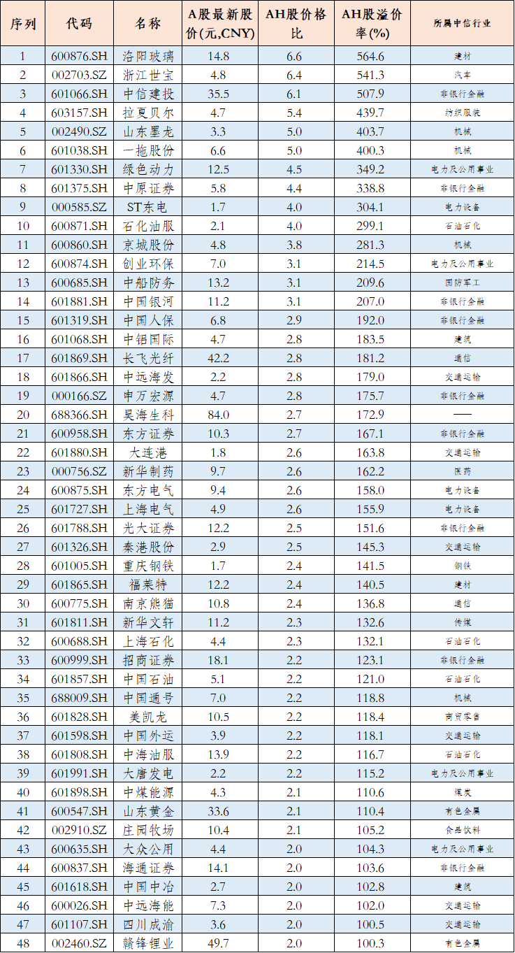 從AH股溢價率超過100%的全部個股來看,洛陽玻璃、浙江世寶、中信建投、拉夏貝爾、山東墨龍這5只個股溢價率位列前五。詳見下表: