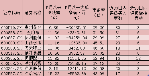 此外,通過梳理包括光大證券、東莞證券等在內的多家券商研報發現,食品飲料行業內,貴州茅臺、五糧液、伊利股份、山西汾酒、海天味業、絕味食品、恒順醋業、瀘州老窖、洋河股份、洽洽食品等10只成份股近30日內均受到機構25次及以上給予“買入”或“增持”等看好評級,后市表現值得關注。