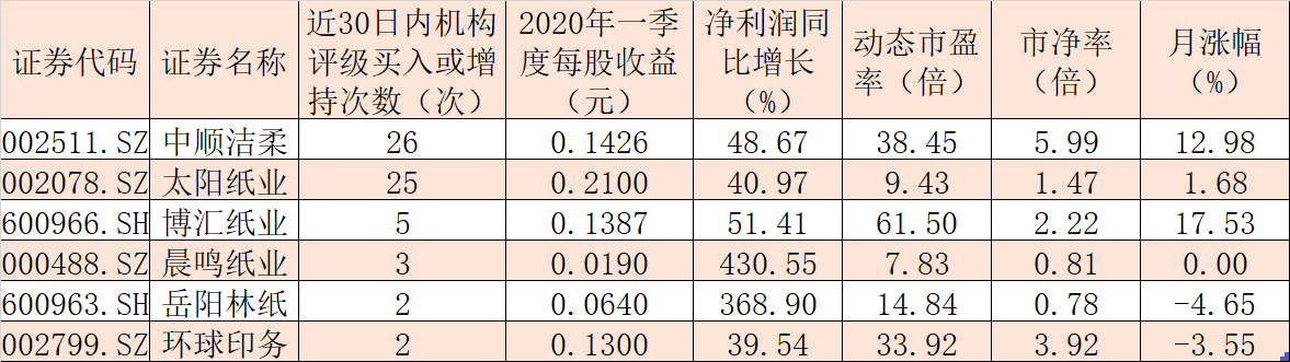 在紙價上漲的支撐下,部分績優股受到機構的關注。統計顯示,在上述15只一季度凈利潤實現增長的個股中,中順潔柔(26次)、太陽紙業(25次)、博匯紙業(5次)、晨鳴紙業(3次)、岳陽林紙(2次)和環球印務(2次)等6只績優股近30日內獲得機構給予“買入”或“增持”等看好評級,后市配置機會凸顯。