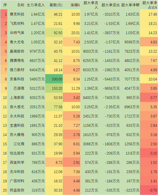 從資金流向來看,光刻膠板塊整體大單資金凈流入10.6億元,其中,雅克科技(1.94億元)、飛凱材料(1.47億元)、華特氣體(1.20億元)、南大光電(1.05億元)等4只個股大單資金凈流入均超1億元,合計凈流入5.66億元。