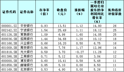 從近期機構評級也可見銀行股熱度升溫。《證券日報》記者根據同花順數據統計發現,31只銀行股獲機構給予“買入”或“增持”評級,平安銀行、寧波銀行、常熟銀行、招商銀行、興業銀行、南京銀行、光大銀行、工商銀行、浦發銀行、郵儲銀行、北京銀行等11只銀行股機構看好評級家數均在10家以上。