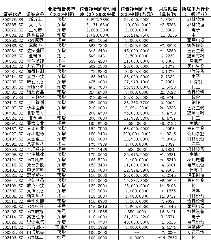 進一步梳理可見,在已發布中報業績預告的公司中,有43家公司凈利潤同比有望實現翻番。其中,新五豐、大北農、三利譜和勁勝智能等4家公司預計今年上半年凈利潤增幅上限在10倍以上,分別為3892.785%、3171.66%、2860.28%和1020%。緊隨其后的是*ST德奧、嘉麟杰、達安基因、亞瑪頓、天保基建和九安醫療等6家公司,凈利潤同比增幅均超500%。