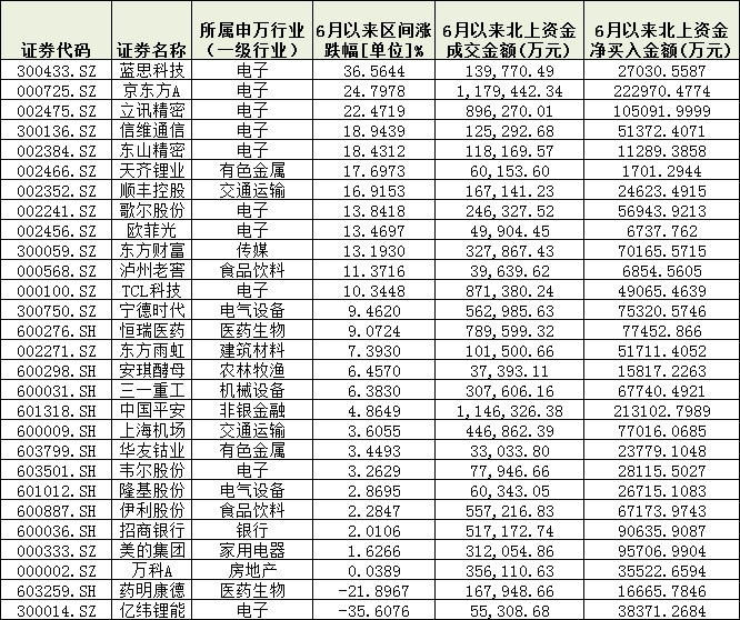 外資的涌入無疑對股價形成良好的支撐。統(tǒng)計發(fā)現(xiàn),在上述28只獲得北上資金凈買入的個股中,6月以來,有22只個股跑贏同期上證指數(shù)。其中,藍(lán)思科技、京東方A和立訊精密等3只電子股月內(nèi)累計漲幅均超20%,分別為36.56%、24.8%和22.5%,盡顯強(qiáng)勢。