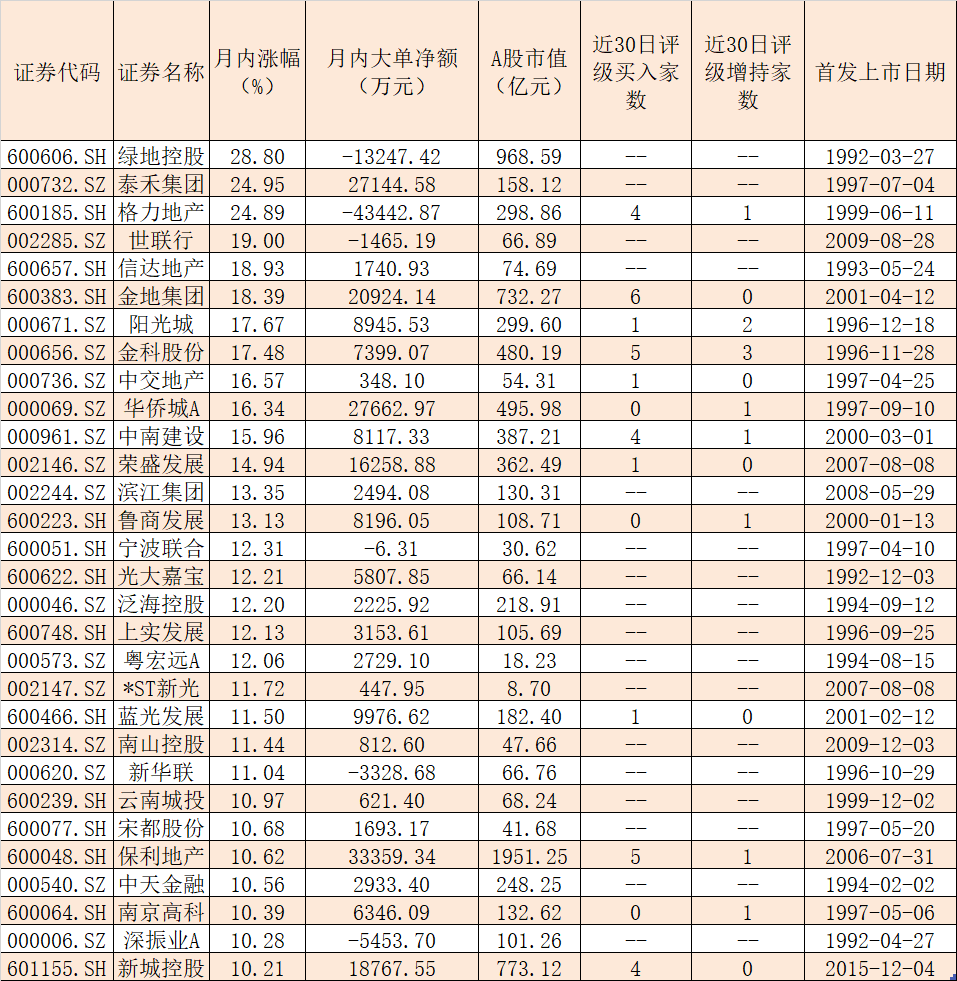 從機構集中推薦來看,萬科A、金科股份、招商積余、保利地產、金地集團、格力地產、中南建設、招商蛇口、新城控股、陽光城、萬通地產、南都物業等12只房地產股近30日內均受到機構兩次及以上給予“買入”或“增持”等看好評級,后市表現值得關注。