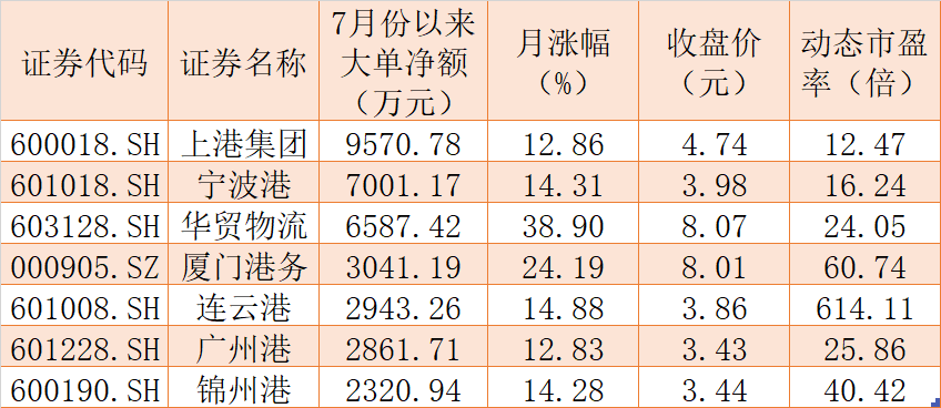 資金流向上,7月份以來,板塊內共有13只概念股呈現大單資金凈流入態勢,上港集團期間累計大單資金凈流入居首,達到9570.78萬元,寧波港(7001.17萬元)、華貿物流(6587.42萬元)、廈門港務(3041.19萬元)、連云港(2943.26萬元)、廣州港(2861.71萬元)和錦州港(2320.94萬元)等6只概念股當日均受到2000萬元以上大單資金追捧,這7只概念股合計吸金3.43億元。