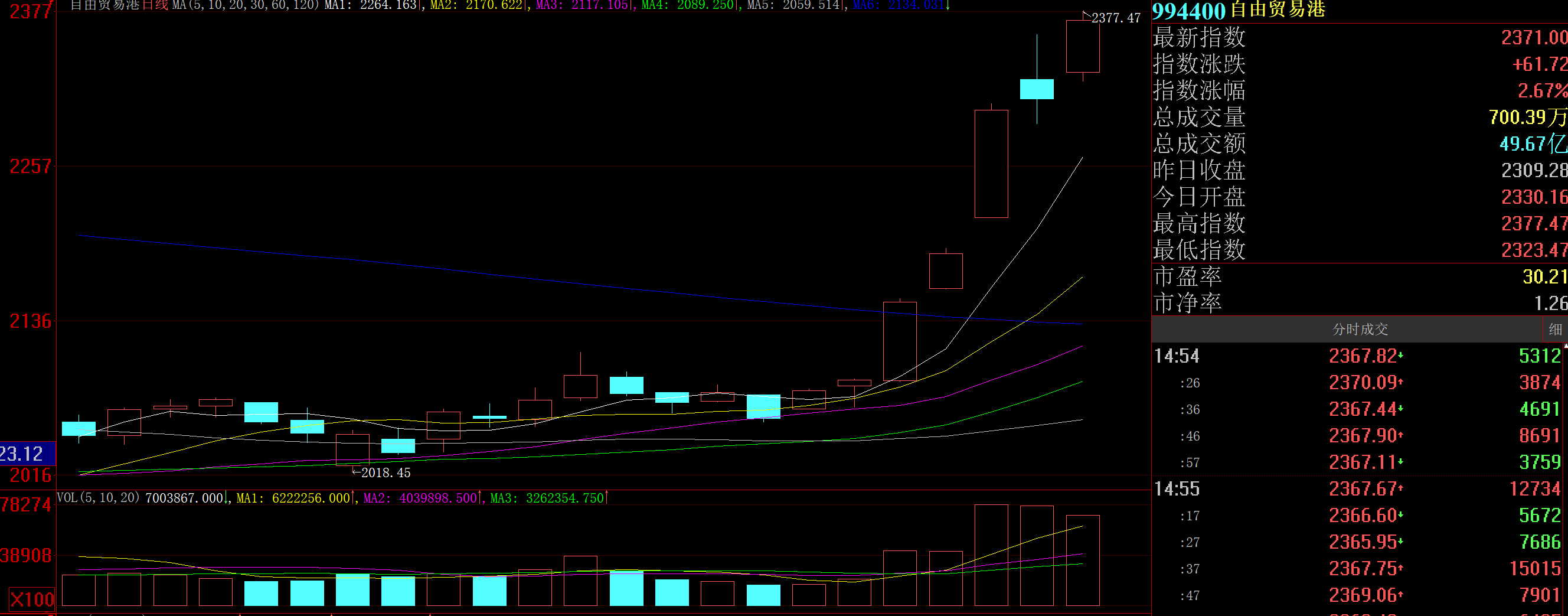 “自由貿易港板塊迎來政策利好,現在股市逐步走向全面牛市,所以各個板塊都有表現的機會,而該板塊是新時代改革開放的新高地,未來建設自由貿易港也會帶來較大的投資機會,相關配置機會顯現。自由貿易港通過制度創新,可能會形成比較好的改革紅利,從而給當地的上市公司帶來一定的機會。”前海開源基金首席經濟學家楊德龍對《證券日報》記者表示。