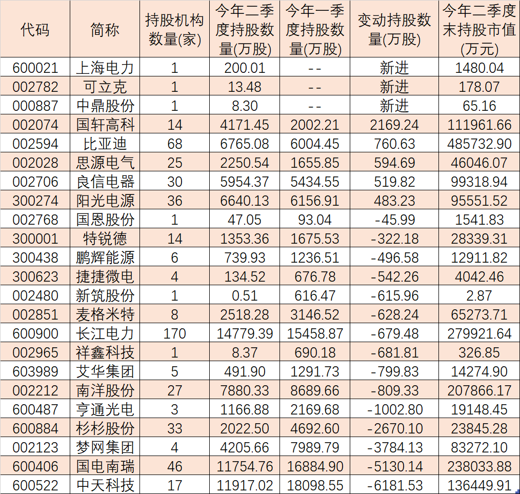 表:今年二季度獲基金持倉的充電樁概念股一覽