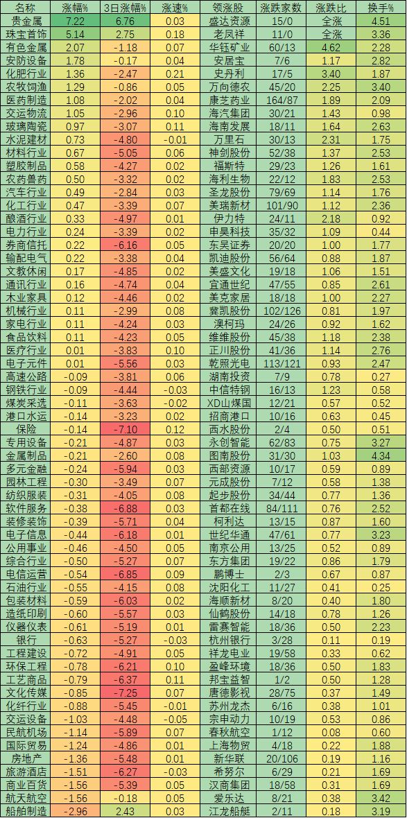 如分析人士所言,受到外部因素擾動,資金有明顯避險需求,周一在市場大幅縮量的背景下,有色金屬板塊出現4.06%的放量就是這一避險需要所致,這其中以黃金、白銀等貴金屬概念股為主。從縮量的行業來看,主要來自非銀金融、鋼鐵、建筑材料等,板塊成交額減幅均超過35%。