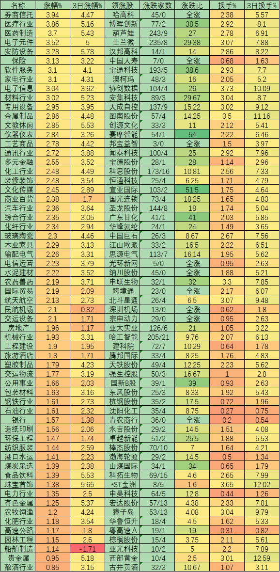 盤面上,申萬一級行業指數中,家用電器、電子和醫藥生物漲幅居前;個股呈普漲格局,上漲股占比高達92.20%。