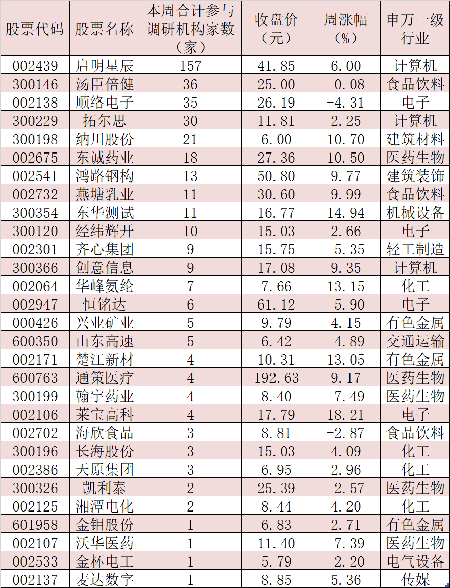 記者進一步統計發現,上述29家上市公司中,有10家公司期間累計接待參與調研的機構家數均在10家及以上,啟明星辰期間累計接待參與調研的機構家數居首,達到157家,湯臣倍健、順絡電子、拓爾思、納川股份等4家公司均受到20家以上機構扎堆調研,分別為:36家、35家、30家和21家,東誠藥業、鴻路鋼構、燕塘乳業、東華測試、經緯輝開等5家公司期間也獲得逾10家以上機構集中調研。
