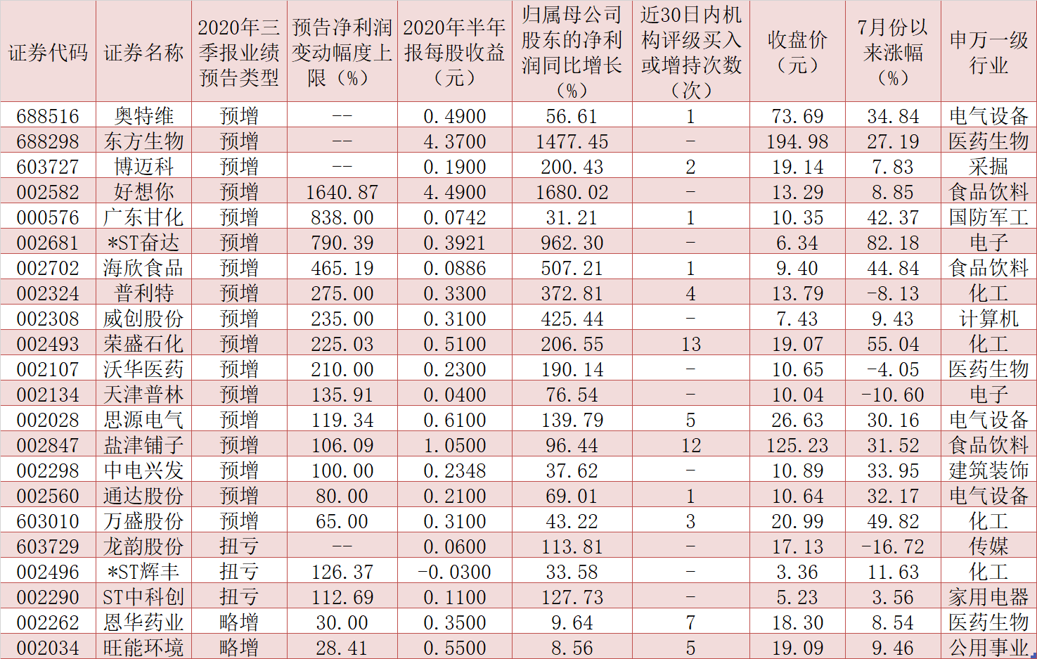 可以看到,好想你、*ST奮達、海欣食品、威創股份、普利特、榮盛石化、沃華醫藥、思源電氣等8家公司有望實現上半年和三季度凈利潤同比翻番,高成長性較為顯著。