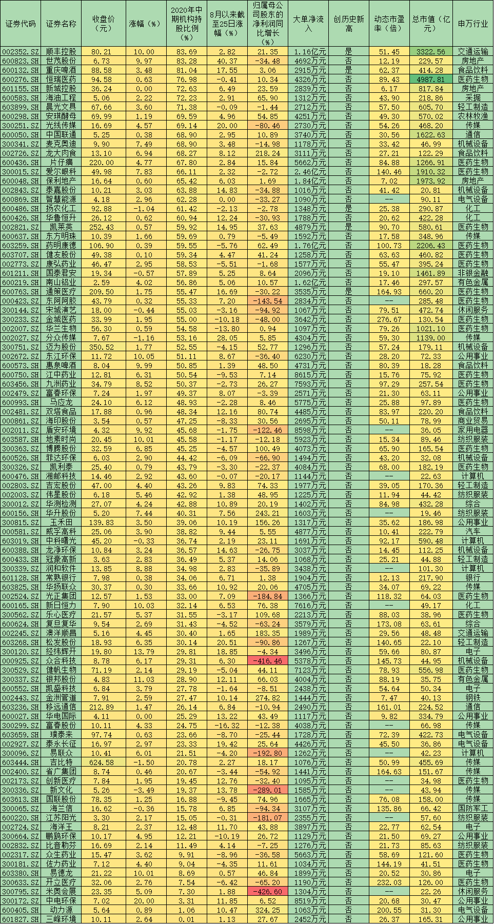 表:周三超1000萬元大單資金凈買入個股2020年中期機構持股比例一覽