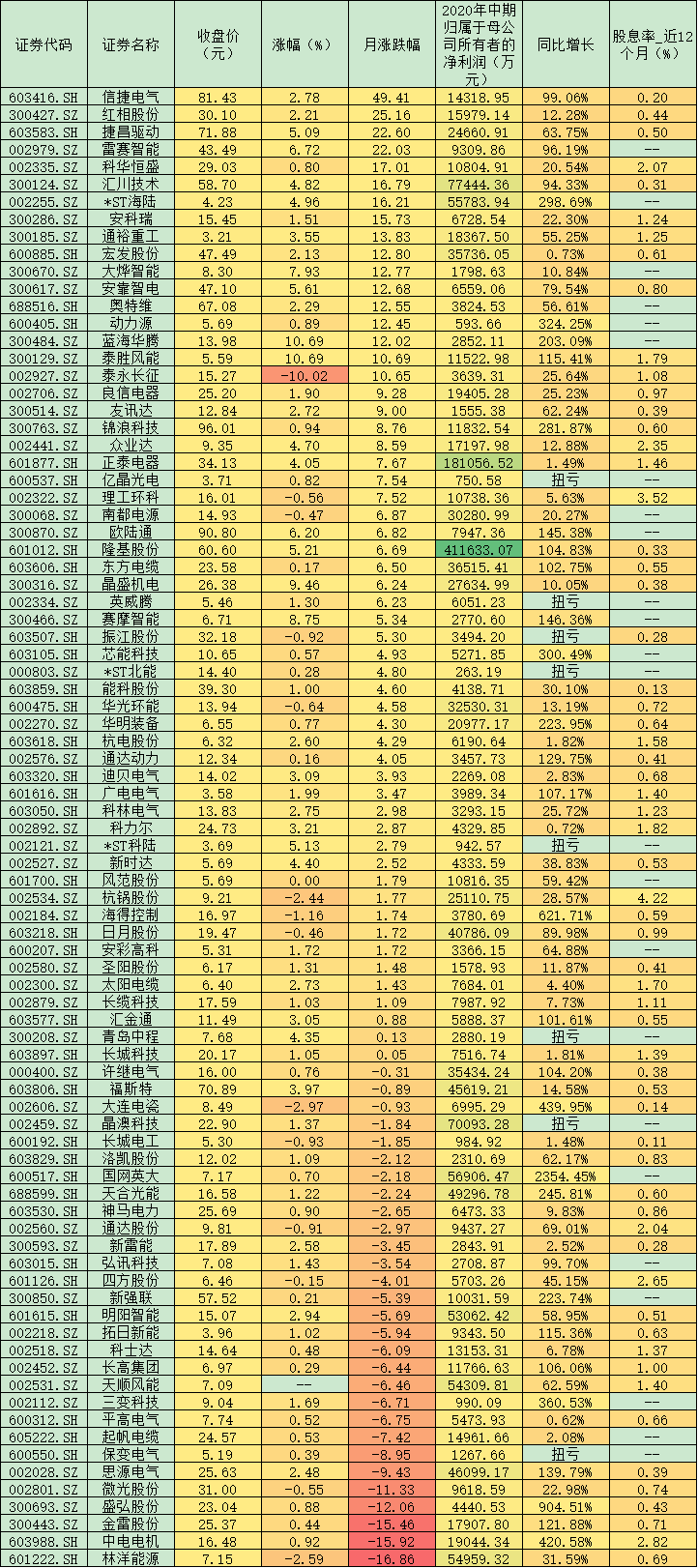 從具體公司來看,已公布業(yè)績實(shí)現(xiàn)歸屬于母公司所有者的凈利潤同比增長(含同比扭虧)的公司達(dá)到85家,占比58.22%,其中,有包括國網(wǎng)英大(2354.45%)、盛弘股份(904.51%)、海得控制(621.71%)在內(nèi)的27家公司同比凈利潤翻倍。此外,還有8家公司今年中報(bào)實(shí)現(xiàn)同比扭虧,扭虧的公司中晶澳科技是扭虧額度最高的公司,從去年同期歸屬于母公司所有者的凈利潤虧損4112.93萬元,至今年實(shí)現(xiàn)70093.28萬元的盈利,值得深入分析研究。