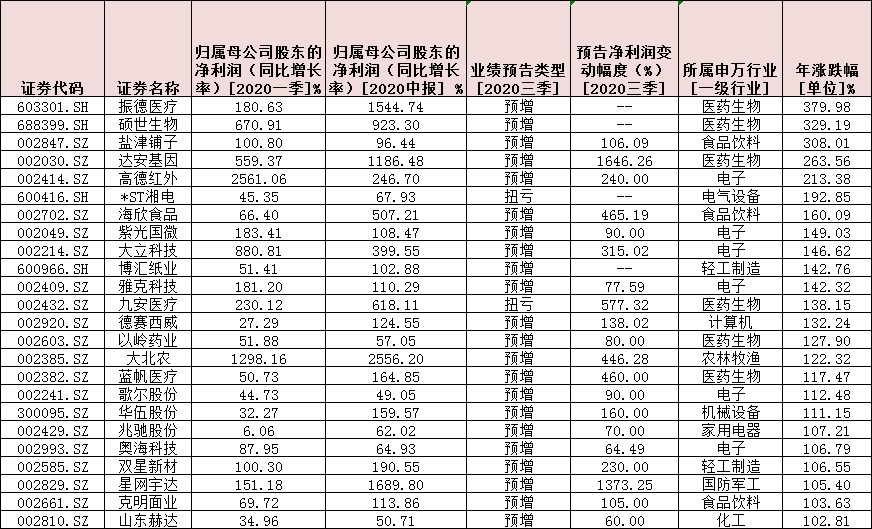 統(tǒng)計(jì)發(fā)現(xiàn),在上述110只三連增的個(gè)股中,今年以來,有78只個(gè)股跑贏同期上證指數(shù)(年內(nèi)累計(jì)漲幅11.6%),占比達(dá)70.9%。其中,振德醫(yī)療、碩世生物、鹽津鋪?zhàn)?、達(dá)安基因、高德紅外等個(gè)股股價(jià)年內(nèi)累計(jì)漲幅均超200%。另外,包括海欣食品、紫光國微、大立科技、博匯紙業(yè)、雅克科技、九安醫(yī)療等在內(nèi)的19只個(gè)股年內(nèi)累計(jì)漲幅均超100%,盡顯強(qiáng)勢(shì)。