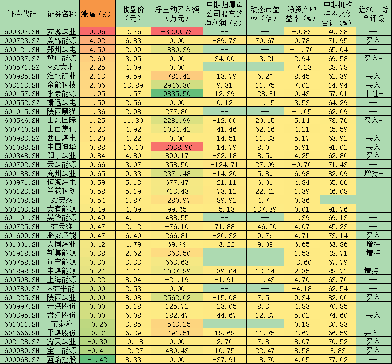 從具體市場表現來看,周四,38只交易中的煤炭采選股有29只實現上漲,其中,安源煤業漲停報收,另有包括美錦能源(4.92%)、鄭州煤電(4.50%)、冀中能源(2.60%)等在內的7只個股漲幅超2%。