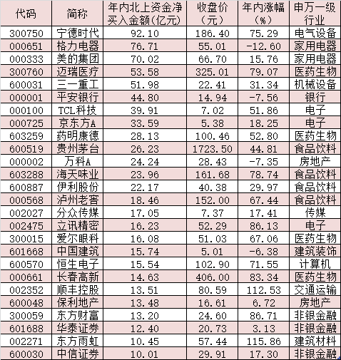 表:今年以來北上資金凈買入額超過10億元的個(gè)股