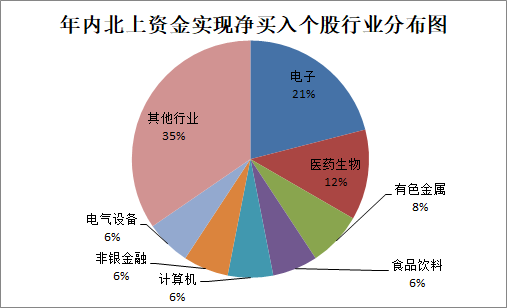 行業(yè)特征方面,上述81只年內(nèi)北上資金青睞個(gè)股主要扎堆在電子、醫(yī)藥生物、有色金屬等三大行業(yè),涉及個(gè)股數(shù)量分別為17只、10只、6只。另外,食品飲料、計(jì)算機(jī)、非銀金融、電氣設(shè)備等行業(yè)也均有5只個(gè)股入圍。可以看到,以醫(yī)藥生物、食品飲料等為代表的大消費(fèi)類龍頭白馬股和科技類龍頭股成為年內(nèi)北上資金重點(diǎn)布局的領(lǐng)域。