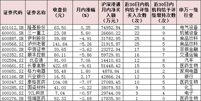 北上資金青睞的個股,不但受到各方的關注,同時也成為各大機構研究的主要對象。統計顯示,上述14只個股,近30日內,全部被機構給予“買入”或“增持”以上評級。其中,隆基股份、三一重工、伊利股份、瀘州老窖、中信證券、順豐控股、比亞迪、長春高新等8家公司被推薦次數均超過20次以上,后市值得關注。