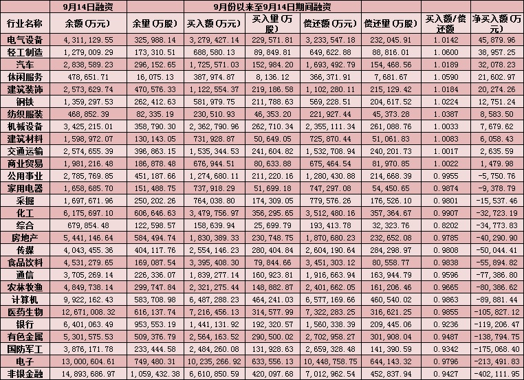 表:9月份以來截至9月14日28個申萬一級行業融資情況
