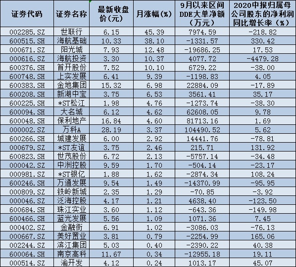可以看到,在機構的關注下,近期地產股表現也是韌性十足。周三,在三大股指全線回落中,房地產行業指數逆市飄紅,漲幅達0.87%。進一步梳理發現,9月份以來房地產行業指數累計跌幅為0.5%,已然跑贏同期上證指數3.29%的跌幅。其中,有56只地產股跑贏同期上證指數,占比行業內成份股逾四成。值得關注的是,世聯行、海航基礎、陽光城、海航投資、首開股份等5只個股月內累計漲幅均超10%。