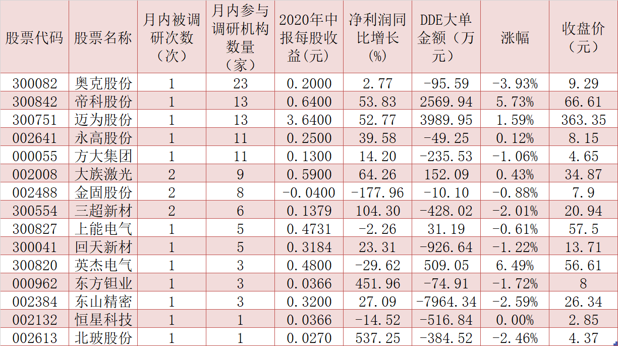 在業(yè)績逐步改善的環(huán)境下,近期機(jī)構(gòu)對(duì)光伏公司調(diào)研熱情高漲,9月份以來共有15家相關(guān)上市公司獲機(jī)構(gòu)密集調(diào)研,奧克股份、帝科股份、邁為股份、永高股份、方大集團(tuán)等5家公司月內(nèi)均受到10家及以上機(jī)構(gòu)扎堆調(diào)研,包括大族激光、金固股份、三超新材等在內(nèi)的10家公司也被機(jī)構(gòu)走訪調(diào)研。