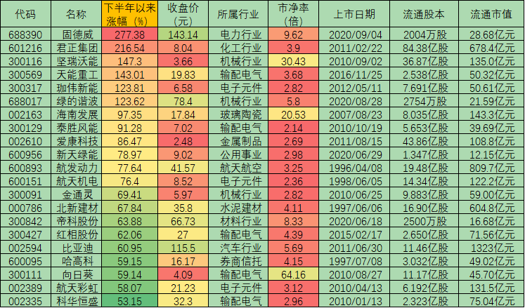 表:下半年以來新能源板塊漲幅超50%個股市場表現(xiàn)一覽