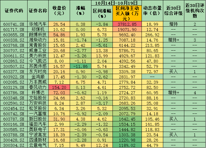 表:10月14日以來(lái)汽車板塊累計(jì)凈主動(dòng)買入超1000萬(wàn)元股一覽